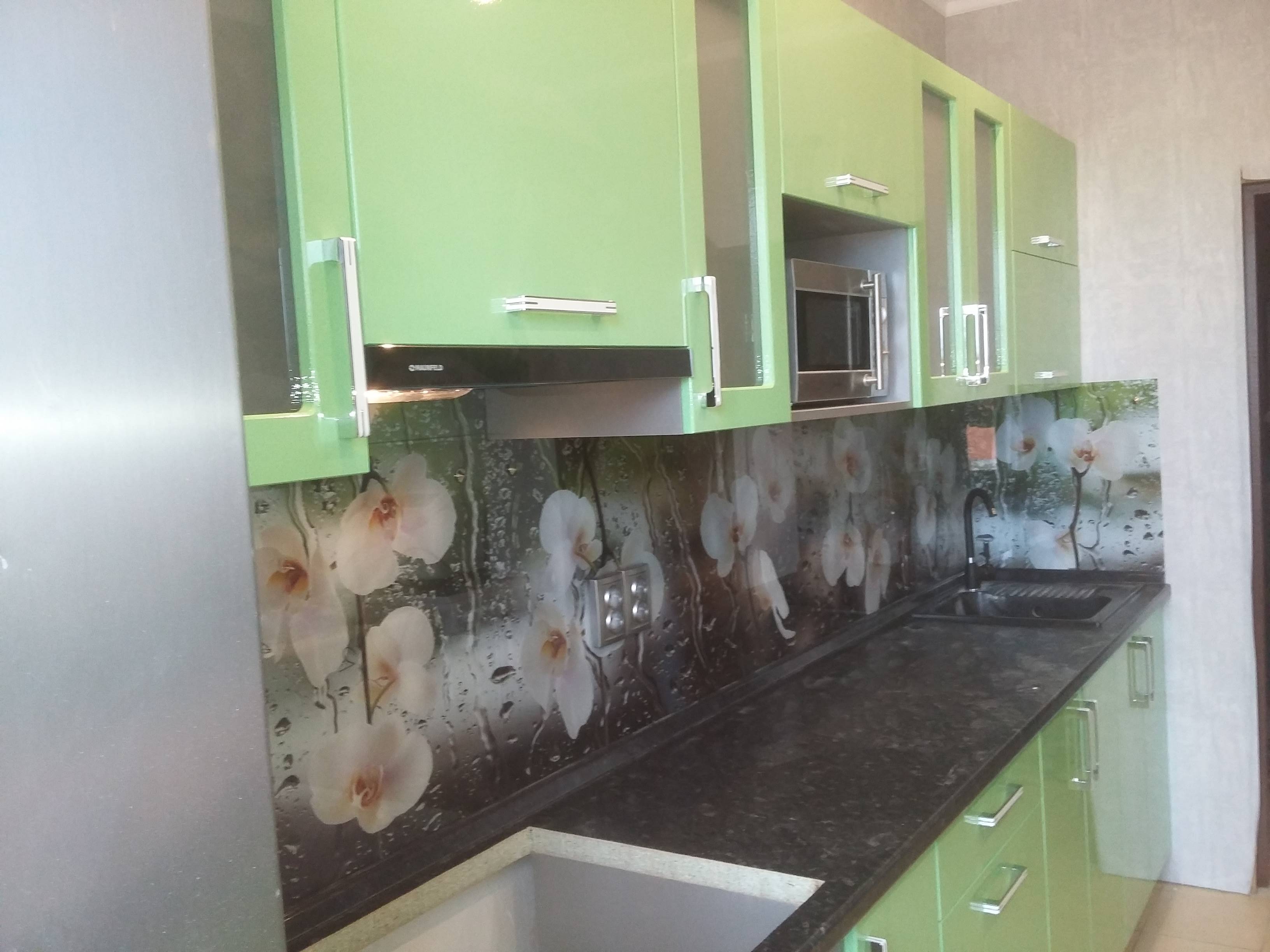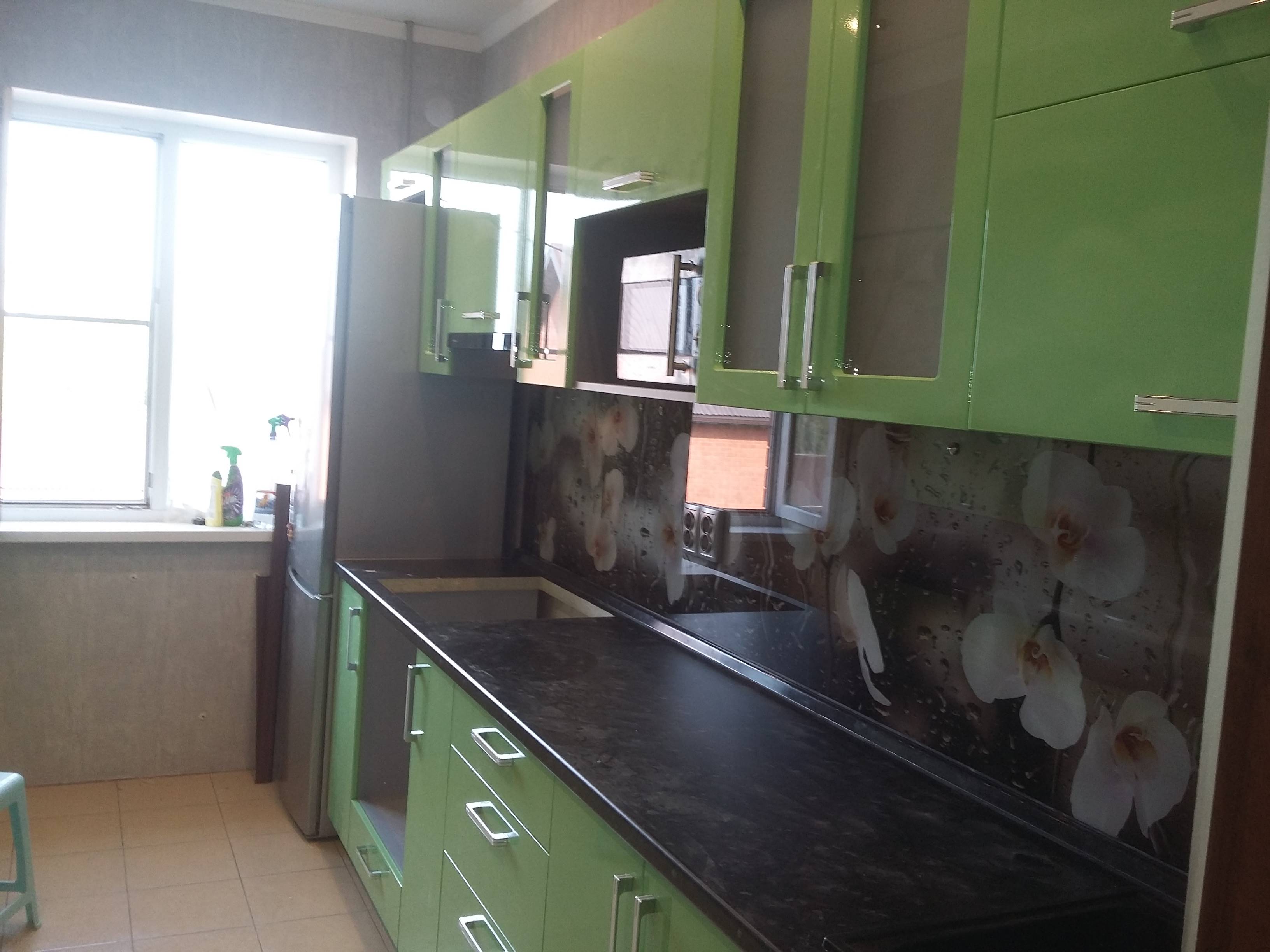 Фасад мдф пленка, столешница 38 мм пластик, фурнитура Boyard, фартук стекло с фотопечатью.